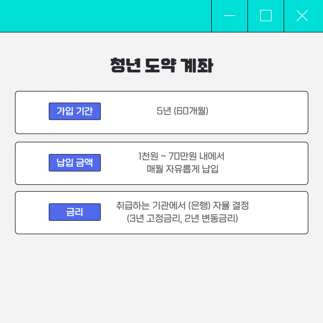청년 도약 계좌는 계좌 개설일(가입일) 기준 만 19세 ~ 34세 이하 청년의 자산형성 지원을 위한 나라의 정책형 금융 상품입니다. 만기 5년(총 60개월) 동안 매월 70만원 한도 내에서 자유롭게 납입하면 매월 최대 6%의 정부 기여금을 지급하고 이자소득에 대한 비과세 혜택을 제공하는 상품입니다.