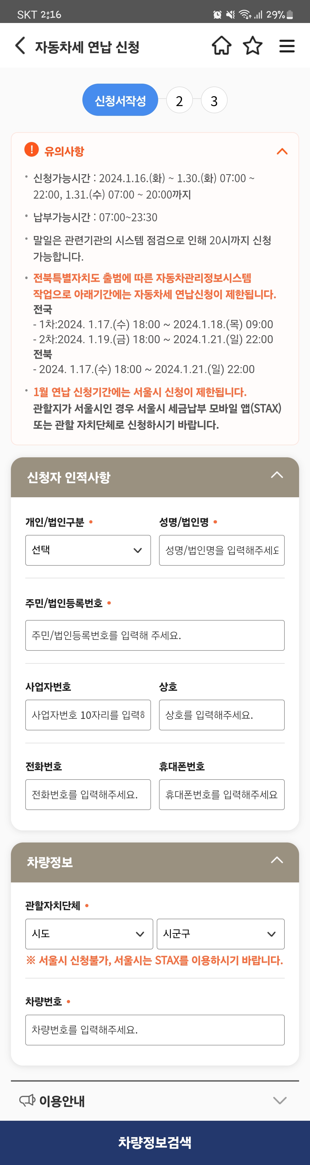저는 핸드폰으로 신청을 했는데 개인 정보와 차량 번호를 넣으면 금방 신청이 완료되었습니다.